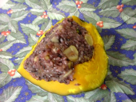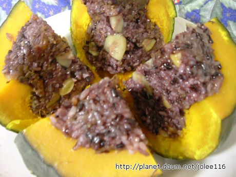 4) 잘 익은 찹쌀밥을 윗 뚜껑을 도려낸 호박속에 채우고