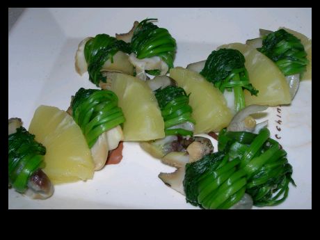 4) 소라편에 돌미나리를 감고 파인애플 한쪽씩 끼워서 접시에 올린다.