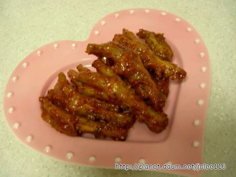 1) 우선 닭발을 생강을 넣고 팔팔 끓여서 잡냄새를 없애고 찬물로 헹구어 놓기