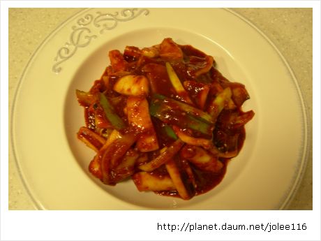 고추가루를 넣고 간장약간,설탕. 물엿.소금약간으로 간하면서 재빨리 볶는다.