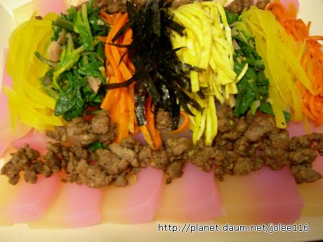 명절끝에 남은 야채와 고기볶음과 김을 채썰어 얹고