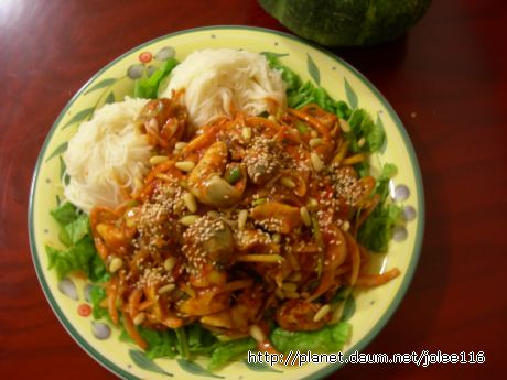 초 고추장에 야채와 함께 소면을 곁들인 골뱅이 무침을 하다.