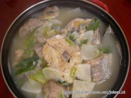 재료: 대구1마리. 무우. 생배추2잎파리. 마늘. 생강. 새우젖. 대파.